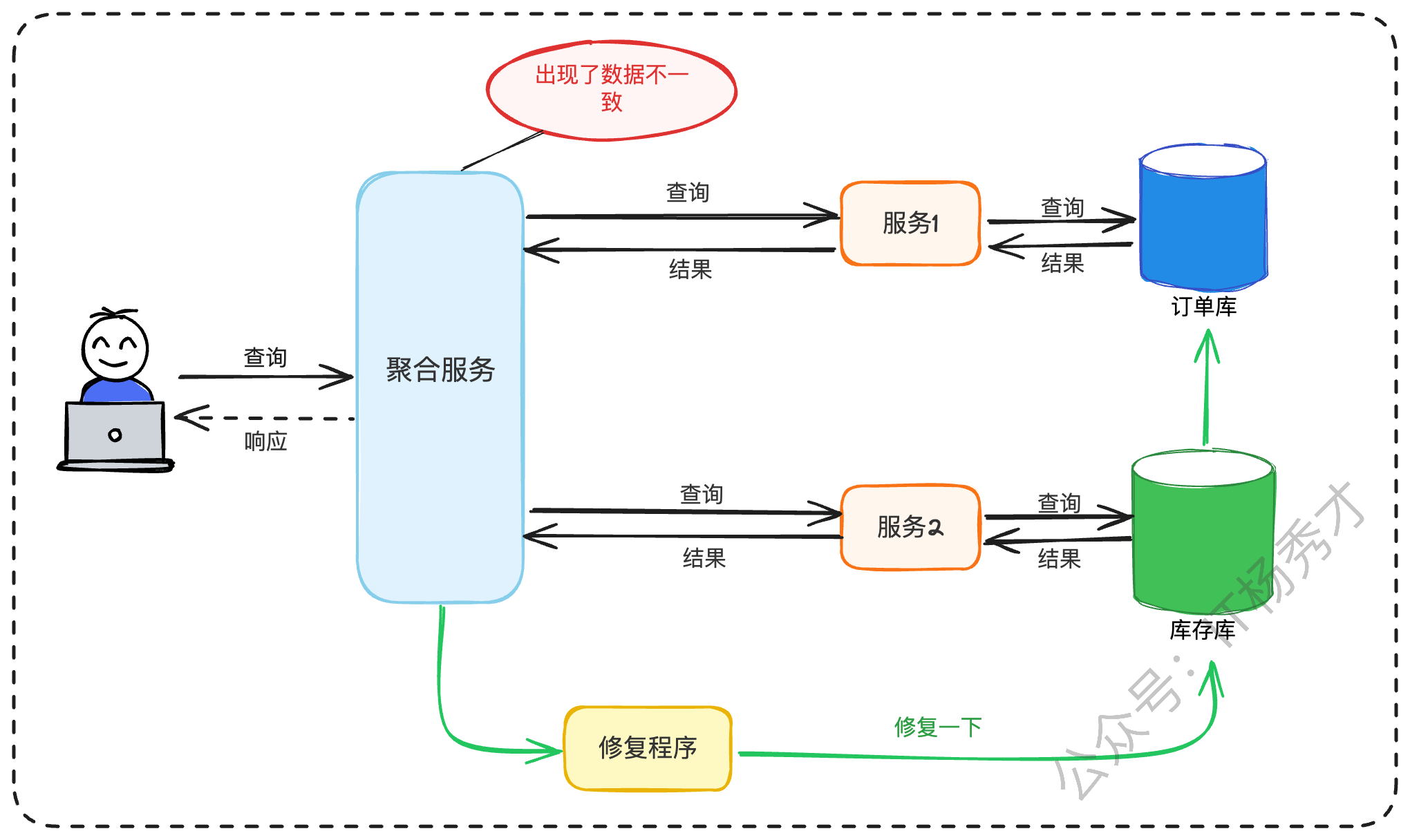 在某些高时效性场景下,还可以采用实时读取修复(在线)。比如在用户查询订单详情时,聚合服务需要同时调用订单库和库存库。当它在读取时发现数据不一致(订单 'CONFIRMED',库存 'LOCKED'),它可以“机智”地返回给用户一个“处理中”的友好提示,并异步触发一个修复程序去修正这个脏数据。