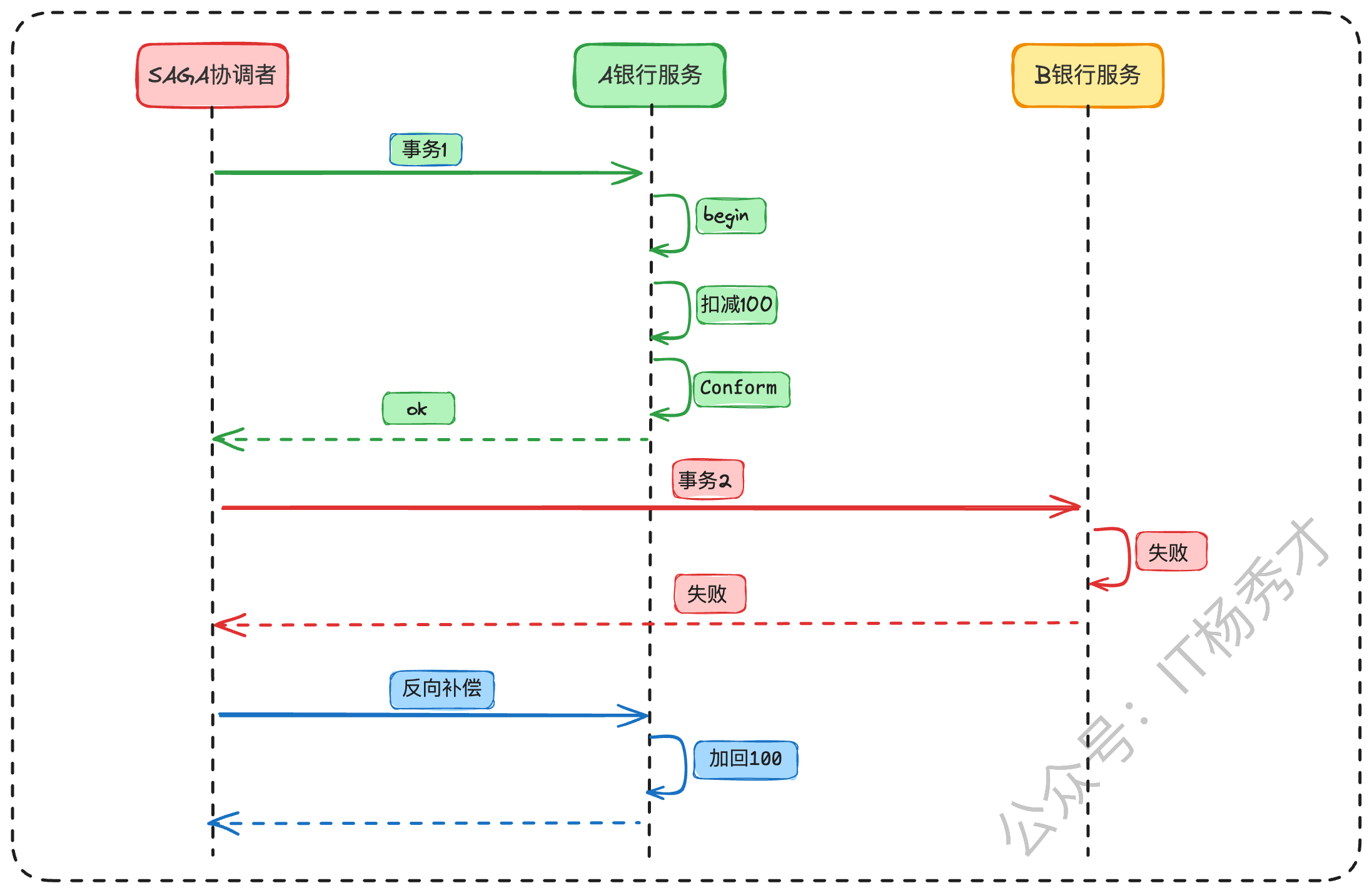 我们用跨行转账的例子来理解:在正向流程中,事务1(A 银行) UPDATE account SET balance = balance - 100 WHERE id = 'A',立即提交。紧接着,事务2(B 银行) UPDATE account SET balance = balance + 100 WHERE id = 'B',但执行失败(例如 B 账户被冻结)。此时,SAGA 启动反向补偿,执行补偿事务1(A 银行):UPDATE account SET balance = balance + 100 WHERE id = 'A' 并立即提交,即 A 银行加回100 块。