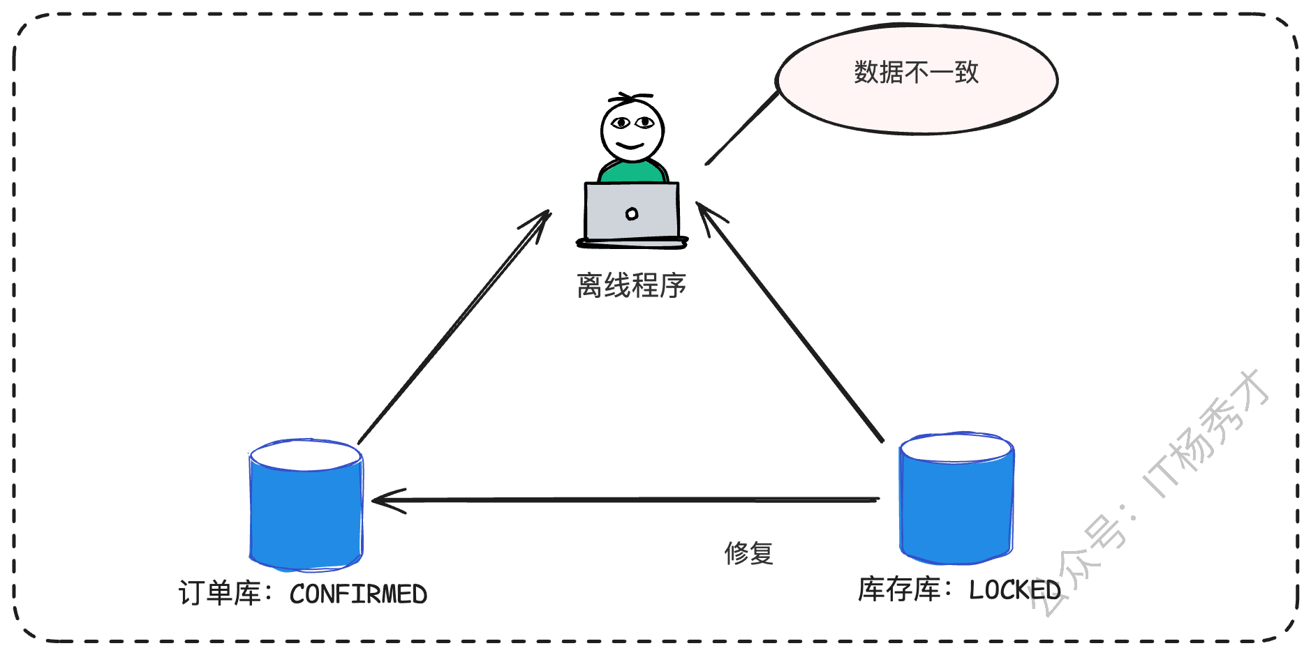 更进一步的方案,是异步校准修复(离线)。建立一个离线的数据比对程序(如定时 Job),T+1 地扫描数据。例如,扫描所有“CONFIRMED”状态超过 5 分钟的订单,去和库存系统比对,一旦发现订单已确认、但库存还处于“LOCKED”状态的数据,就立即执行修复。