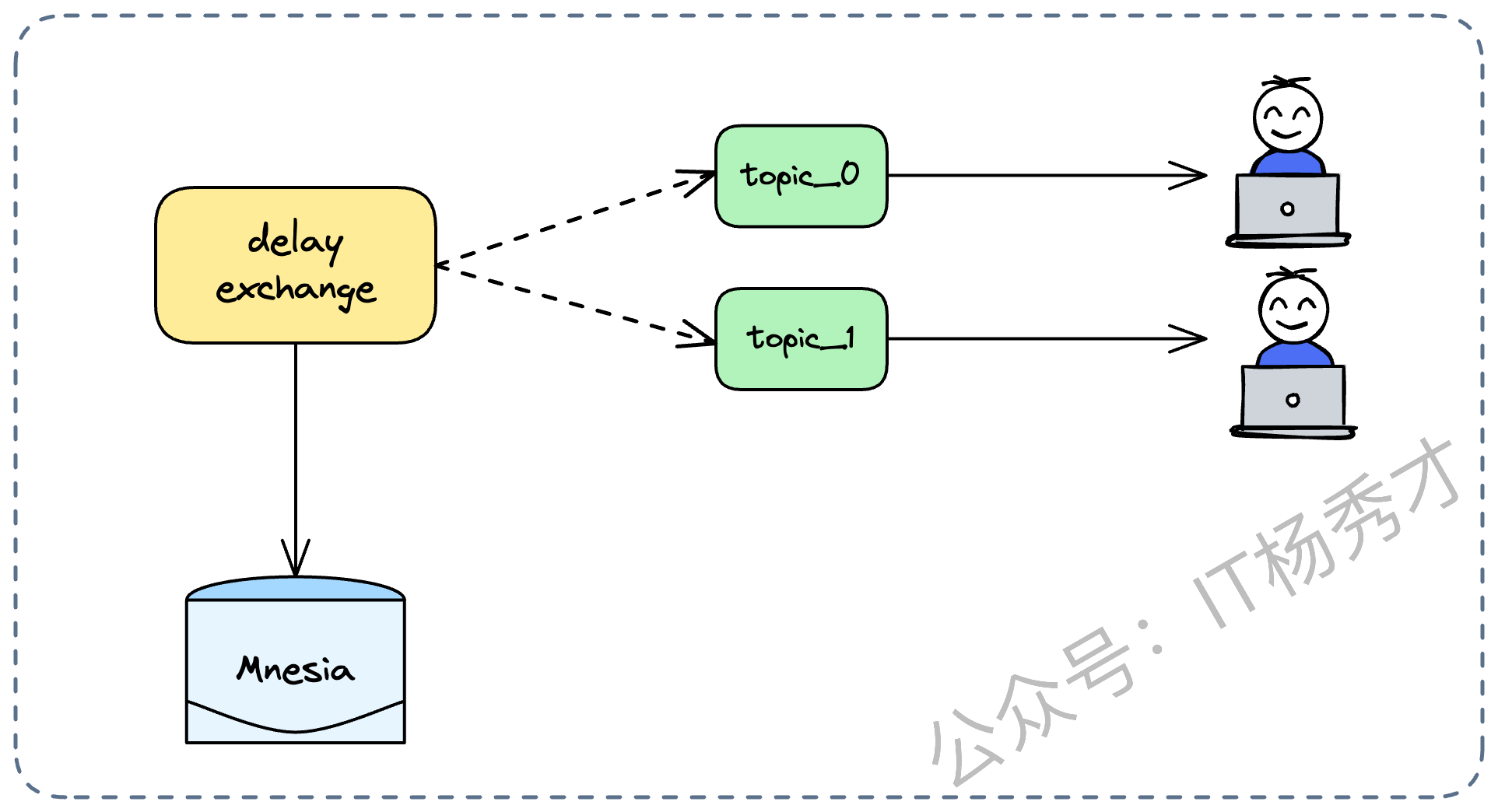 这里需要稍微展开一下 Mnesia 的机制:你可以把 Mnesia 想象成一个轻量级的、嵌入式的数据库,它支持 RAM(内存)和 Disc(磁盘)两种存储模式。当消息带有 x-delay 头时,插件会将消息体序列化后存储在 Exchange 所在节点的 Mnesia 表中。