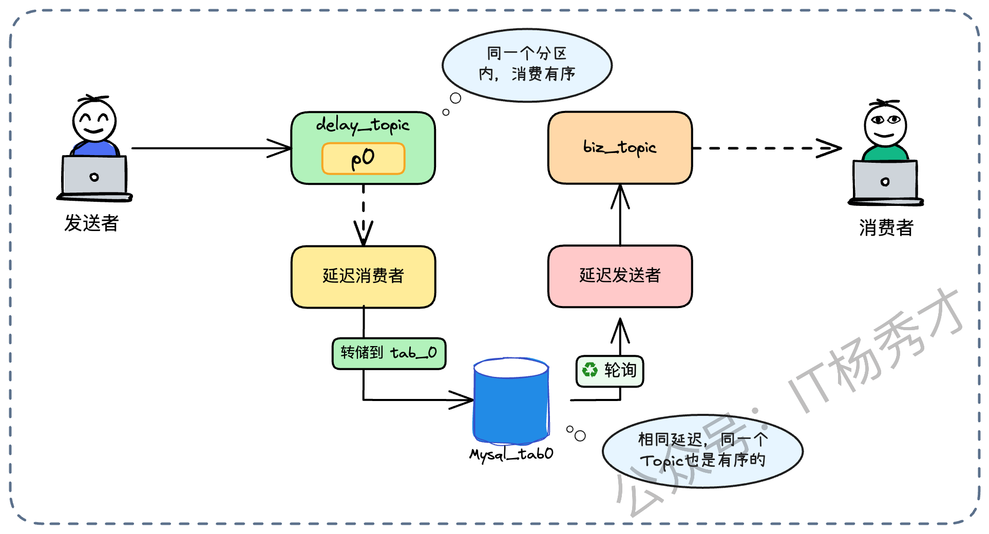 Delay Topic(入口):这是所有延迟消息的蓄水池。业务方不管延迟多久,先把消息发到这里。