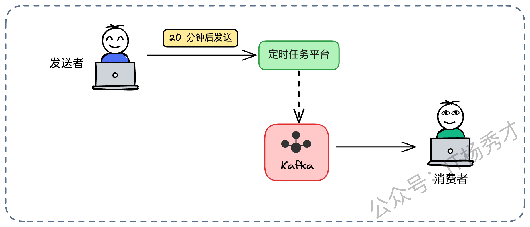 既然 Kafka 存不住延迟消息,那我们就找个能存的地方。比如,业务方产生了一个“20 分钟后发送”的请求,我们不要直接发给 Kafka,而是把它注册到一个支持持久化的定时任务平台(比如 Quartz 集群,或者由 XXL-JOB 调度的服务)。