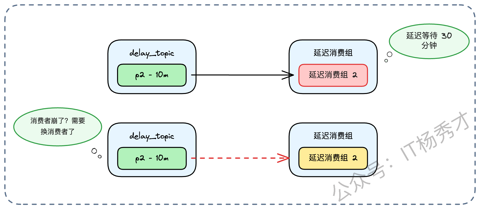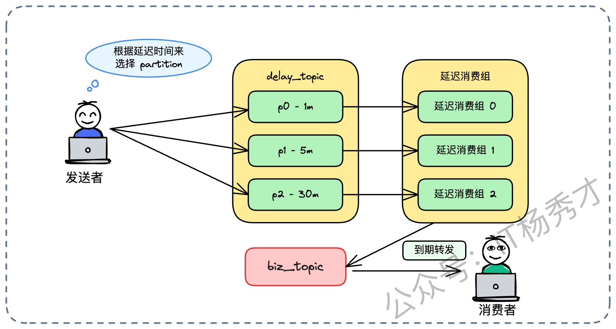 这是一个很好的架构思考题。除了分区方案,我们当然也可以创建 delay_1m_topic、delay_5m_topic。