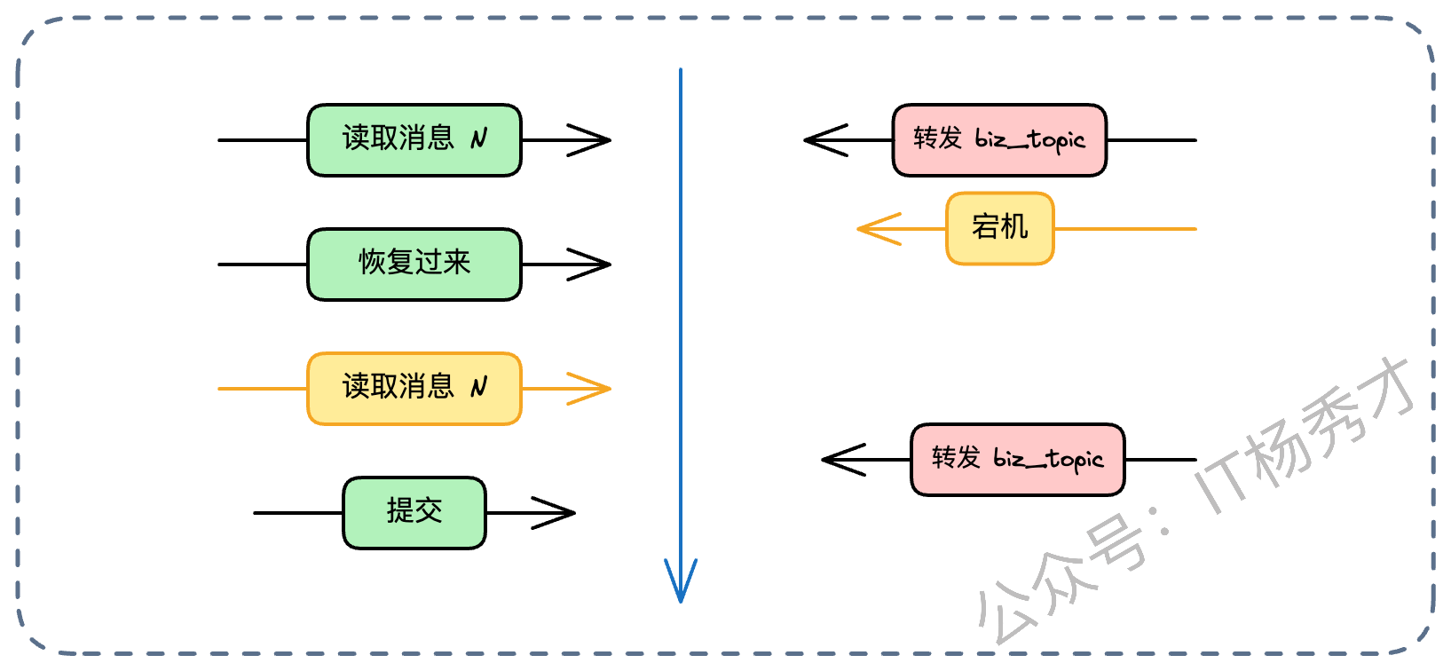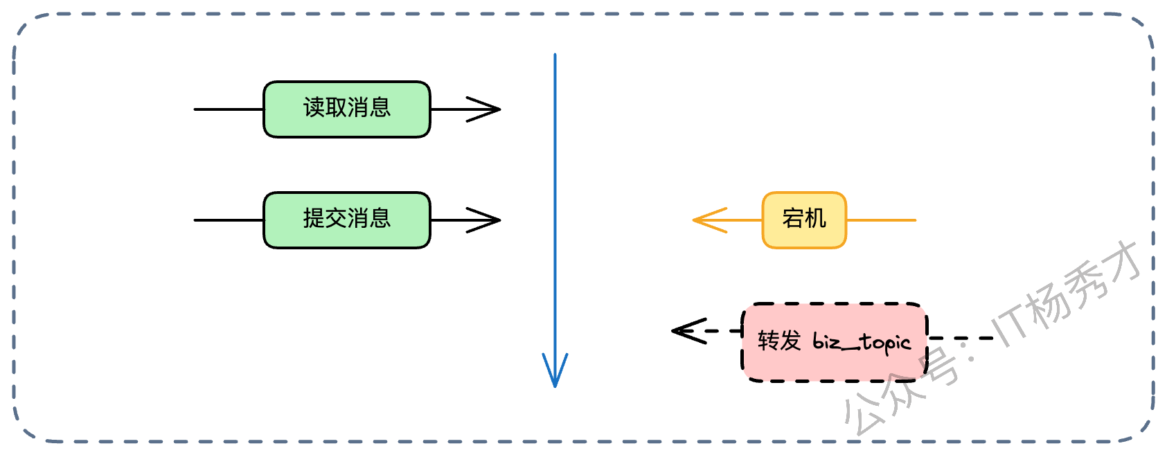 如果 Offset 提交成功了,但在转发的一瞬间,服务宕机了。重启后,因为 Offset 已经提交,这条消息就不会再被拉取。结果就是:消息丢了。这在金融或订单场景下是绝对不可接受的。