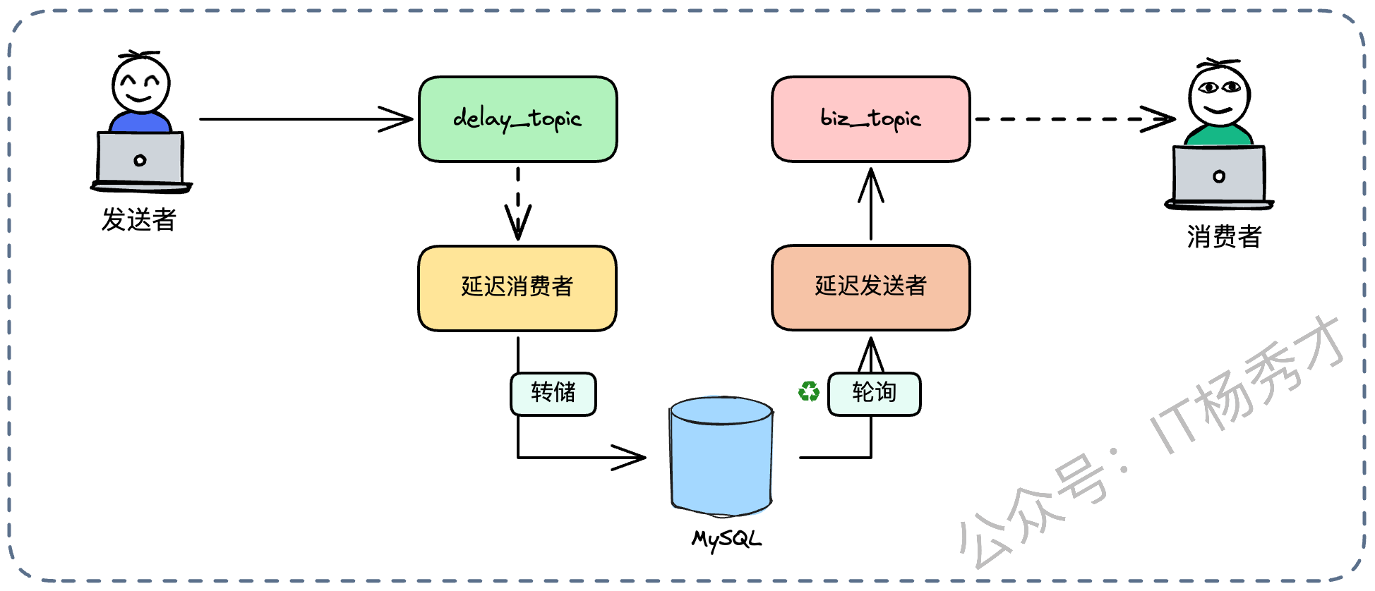 Delay Sender(调度员):这是一个扫描服务,它不断轮询数据库,查找那些“执行时间 <= 当前时间”且状态为“未发送”的消息。一旦捞到,就把它发给真正的