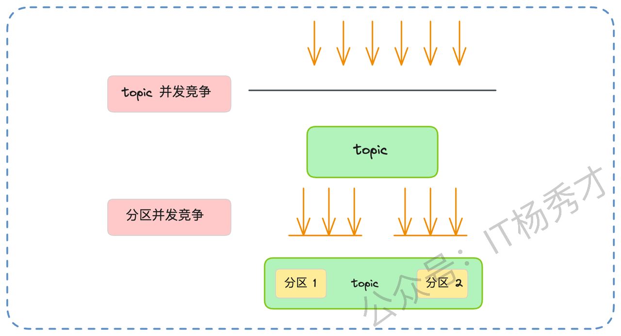 分区机制本身也是高性能的一个关键。它实现了缩小并发粒度。如果 Kafka 只有一个全局的 Topic,那所有的生产者写入、消费者拉取,都必须对这一个 Topic 加锁,并发度会非常低。引入分区后,并发的粒度从 Topic 级别降低到了分区级别。生产者可以同时向分区0、分区1、分区2写入,消费者也可以同时从不同分区拉取,它们之间互不干扰,极大地提升了系统的并发处理能力。