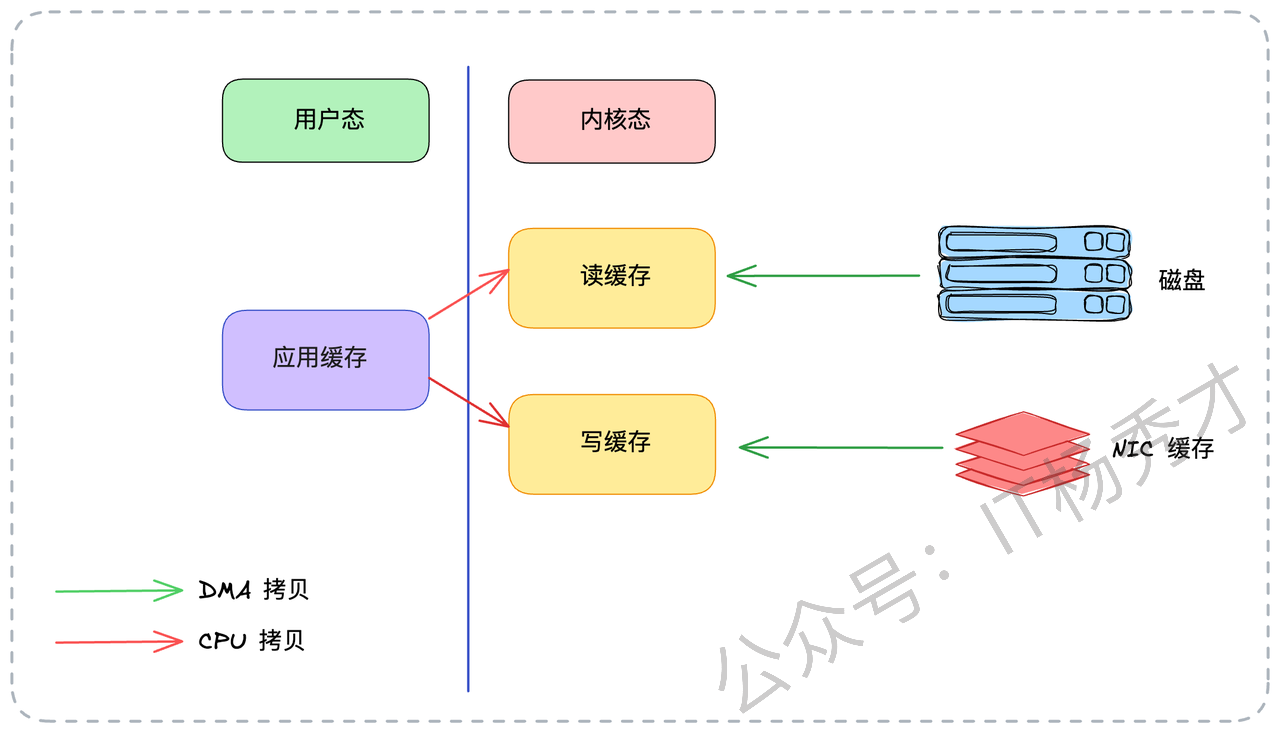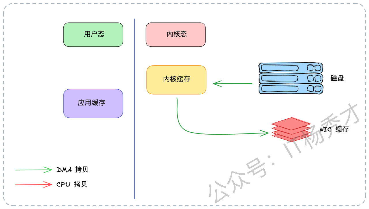 第2次拷贝(DMA):数据直接从内核态缓冲区拷贝到网卡(NIC 缓存)。