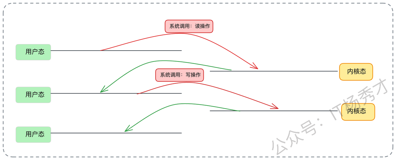 在这个过程中,数据在内核态和用户态之间来回切换,发生了 2 次 CPU 拷贝,以及 4 次上下文切换(用户态与内核态的切换)。