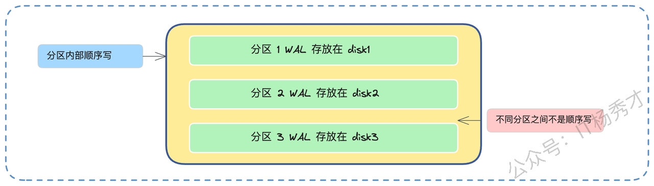 “不过,这个顺序写的好处是针对单个分区而言的。如果我们设计不当,比如在同一块磁盘上创建了 1000 个分区。当这 1000 个分区同时有数据写入时,对于操作系统和磁盘来说,它需要交替地在 1000 个不同的文件末尾写入。磁盘磁头将不得不来回跳跃,这实质上已经从顺序写退化成了随机写,导致性能急剧下降。”