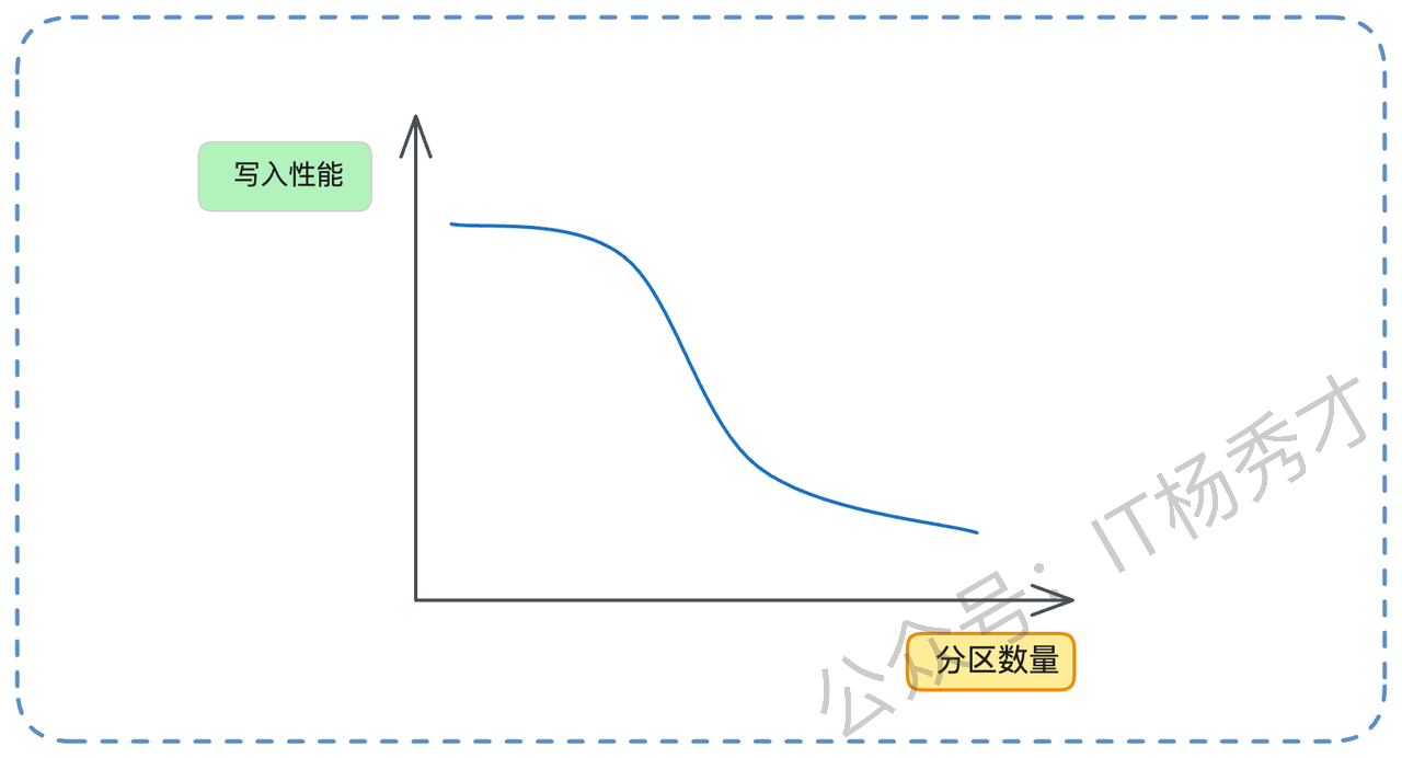 “举个例子,假设要写入 100M 的数据。如果只有一个分区,那就是一次性顺序写入 100M。但如果有 100 个分区,每个分区写入 1M,它的性能会差很多。因为一个 Topic 至少有一个分区,所以 Topic 数量过多,同样会导致写入性能衰退。”