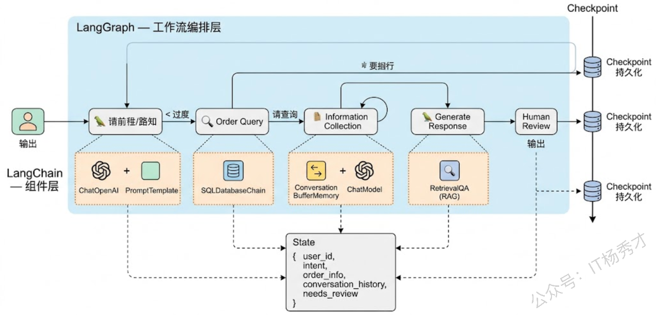 流程中有人工介入点。需要人类审核 Agent 的决策后再继续?LangGraph 的 Checkpoint 机制让你可以在任意节点暂停并恢复,而不需要自己维护复杂的状态持久化逻辑。