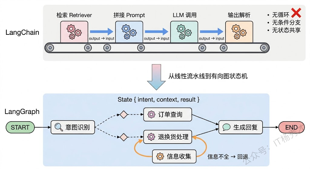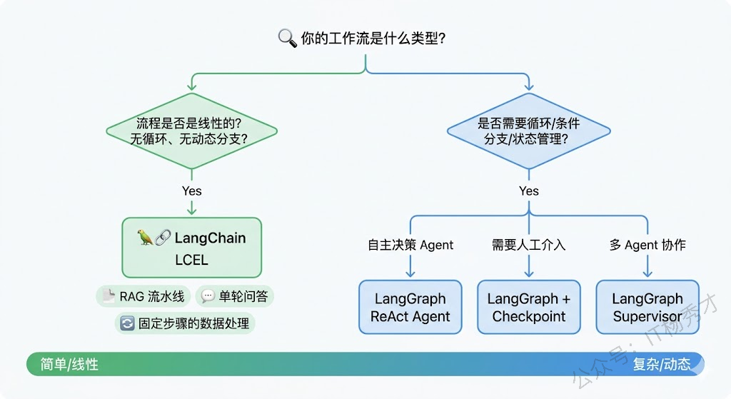 如果你的需求是一个线性流程——文档加载→切分→Embedding→存储→检索→生成,或者用户输入→意图分类→模板化回复——那用 LangChain 的 LCEL 完全足够,代码量少、概念简单、调试方便。强行用 LangGraph 反而增加了不必要的复杂度。