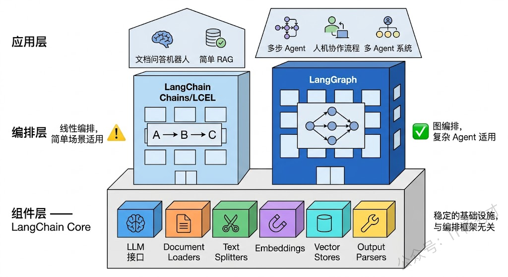 说了这么多 LangGraph 的优势,是不是意味着 LangChain 已经过时了?完全不是。理解 LangChain 的价值,需要把它拆成两层来看。