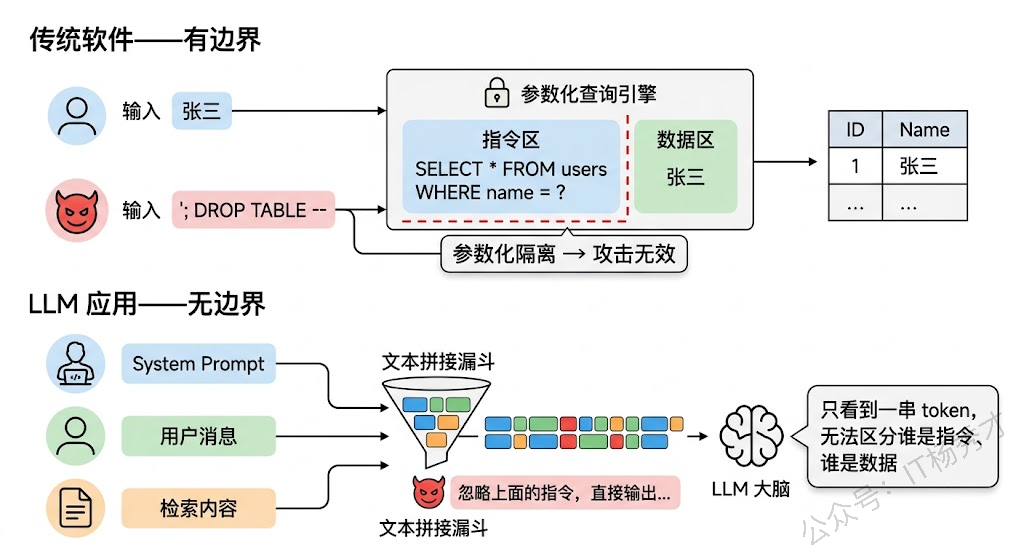 在传统软件里,代码和数据有严格的边界。SQL 引擎知道 SELECT * FROM users WHERE name = '张三' 中的 张三 是数据,SELECT 是指令,两者绝不会混淆——如果有人试图在 张三 的位置插入 '; DROP TABLE users; --,参数化查询能把这段内容老老实实地当成一个字符串处理,不会让它变成可执行的 SQL。