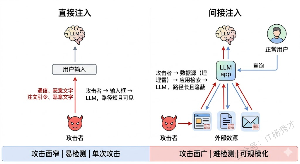 理解了根源之后来看具体的攻击方式。按照攻击路径的不同,Prompt 注入可以分为两大类:直接注入和间接注入。