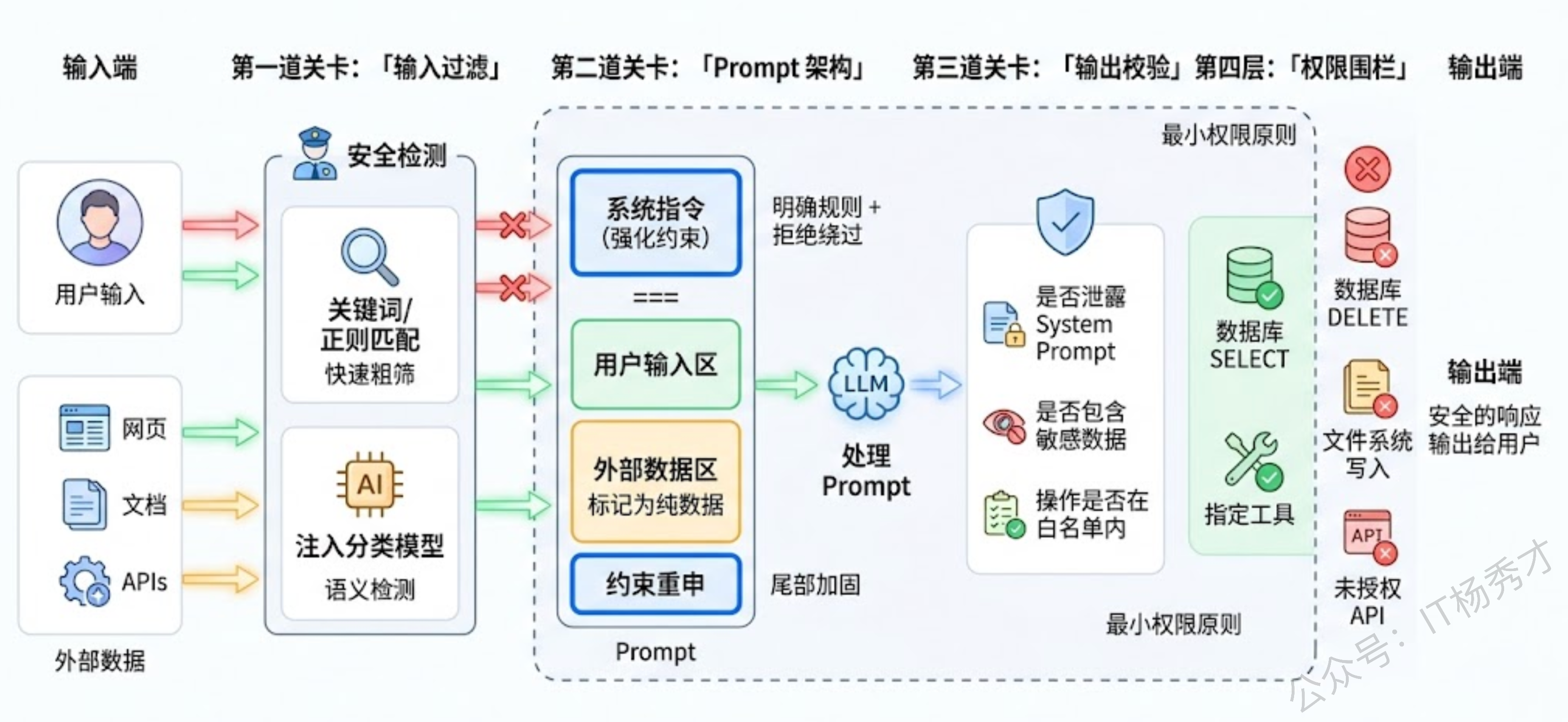 第三层:输出校验与过滤。即使注入成功了,我们还可以在输出端做最后一道防线。在 LLM 的回答返回给用户之前,检查输出中是否包含不应该出现的内容——比如是否泄露了 System Prompt、是否包含了敏感数据、是否执行了未授权的操作。对于 Agent 场景,这一层尤其重要:在 Agent 调用工具之前,先检查它要执行的操作是否在预定义的白名单内、参数是否合理。发邮件、删文件、调用外部 API 这类高危操作必须经过额外确认,不能让 LLM 直接执行。