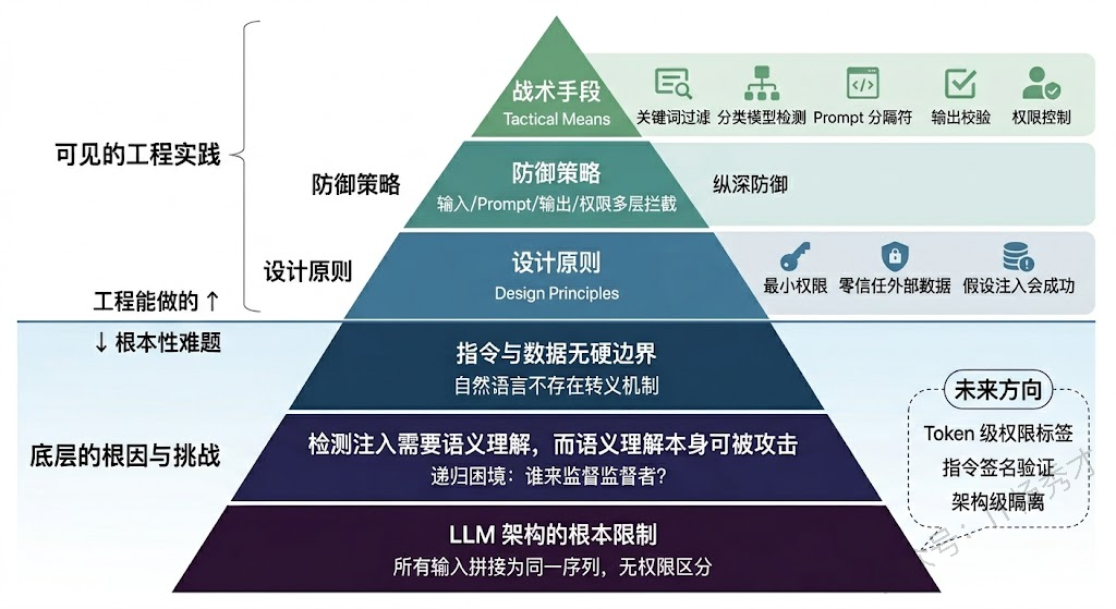 说完了攻击,来谈防护。一个必须先摆正的认知是:目前不存在任何一种方法能彻底解决 Prompt 注入问题。这不是工程做得不够好的问题,而是由 LLM 的工作原理决定的——只要模型无法从根本上区分指令和数据,注入的可能性就始终存在。但这不意味着我们束手无策,工程上的正确思路是纵深防御(Defense in Depth)——在多个层面设置防线,每一层都不完美,但叠加起来能把攻击的成功率降到可接受的水平。