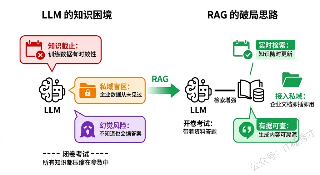 RAG 的核心思路其实很直观——它要解决的是大语言模型知识层面的三大先天缺陷:训练数据有截止日期导致知识过时、缺乏企业私域知识、以及在知识不足时容易产生幻觉。RAG 的做法不是去改变模型本身,而是在推理阶段给模型补充知识的机会。