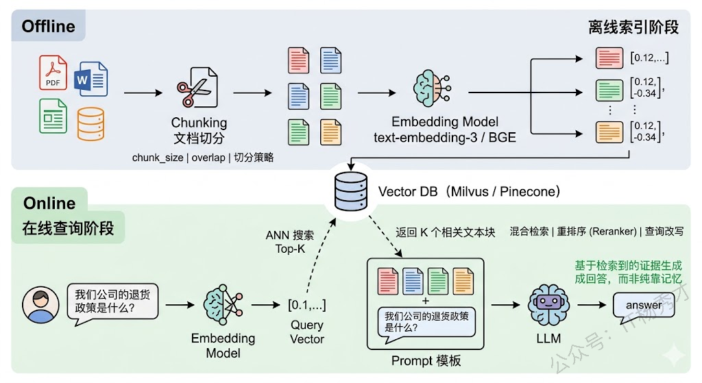 理解了动机之后,我们来看 RAG 在技术上到底是怎么运转的。一个标准的 RAG 系统可以拆成两个阶段:离线索引阶段和在线查询阶段。