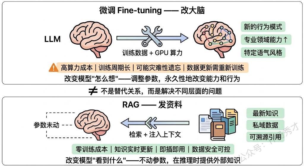 要理解RAG 和微调的对比,我们可以用一个形象的比喻。微调就像是给一个人"补课"——你改变的是他脑子里的知识结构和思维方式。微调后的模型,它的参数被永久性地更新了,它"记住"了新的知识或"学会"了新的行为模式。RAG 则像是给一个人"发参考资料"——你没有改变他的能力,而是在他答题的时候递给他一叠相关材料,让他照着材料来回答。