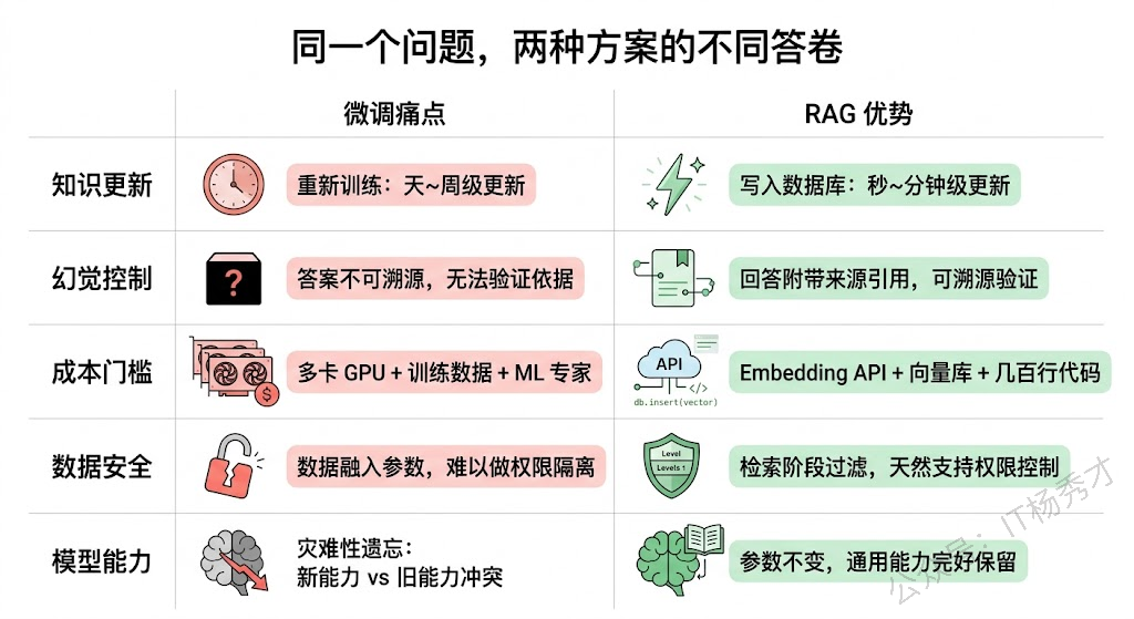 优势三:成本低、门槛低、落地快。微调需要 GPU(通常是多卡甚至集群)、需要精心整理的训练数据集、需要调超参、需要处理过拟合和灾难性遗忘等问题,对团队的 ML 能力有要求。RAG 的门槛低得多:一个 Embedding API、一个向量数据库、一个 LLM API,加上几百行代码,就能搭起一个可用的原型。这也是为什么 RAG 成为了当前 LLM 应用落地最主流的范式——它让没有深厚 ML 背景的开发团队也能快速构建知识增强的 AI 应用。