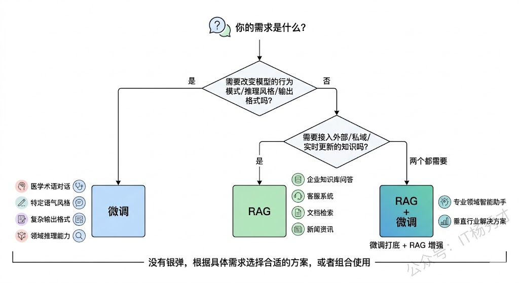 实际上,RAG 和微调最好的关系是互补而非互斥。在很多生产级系统中,两者是一起用的:先微调让模型具备领域专业能力和特定行为模式,再用 RAG 为它提供实时的、可更新的事实性知识。这种"微调打底 + RAG 增强"的组合拳,才是目前业界最成熟的实践方案。