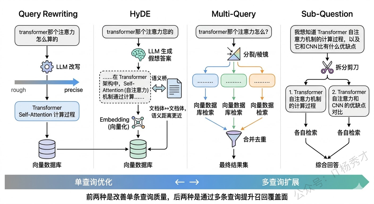 很多时候检索质量差,根源不在检索引擎,而在用户的查询本身。用户的提问可能太模糊、太口语化、或者包含了多个子问题混在一起。如果能在检索之前先把查询"加工"一下,检索效果会有质的提升。