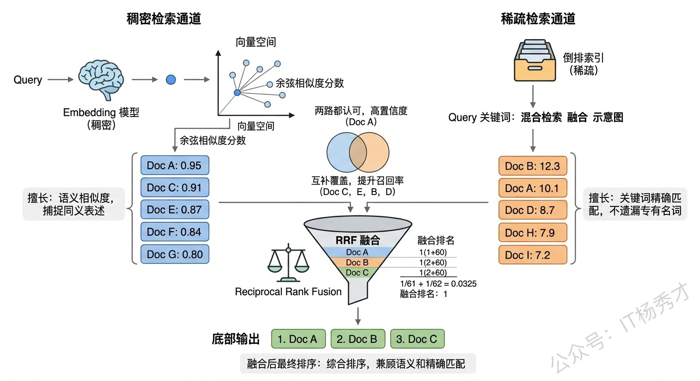 融合两路结果的常用方法是 Reciprocal Rank Fusion(RRF)。它的逻辑很简单:对于每个候选文档,根据它在两路检索结果中的排名分别算一个分数(排名越高分数越高),然后把两个分数加起来作为最终得分。这种方法不需要对两路检索的分数做归一化(BM25 的分数和余弦相似度的量纲完全不同),直接用排名来融合,简单有效。Elasticsearch 8.x 和大多数向量数据库(如 Weaviate、Qdrant)都原生支持混合检索。