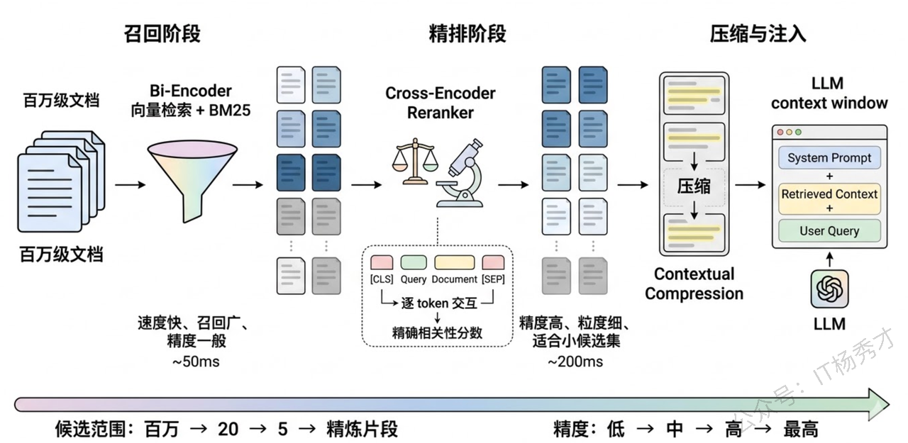 这就是经典的"召回-精排"两阶段架构:第一阶段用速度快但精度一般的 Bi-Encoder 做大范围召回,第二阶段用精度高但速度慢的 Cross-Encoder 做小范围精排。这个架构在搜索引擎和推荐系统中已经用了很多年,移植到RAG 中同样非常有效。常用的 Reranker 模型包括 Cohere Rerank、bge-reranker、以及基于 cross-encoder 架构的各类模型。