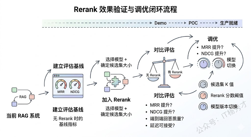 最后聊一下怎么验证 Rerank 到底有没有用、用得好不好,这也是工程落地中容易被忽视的环节。