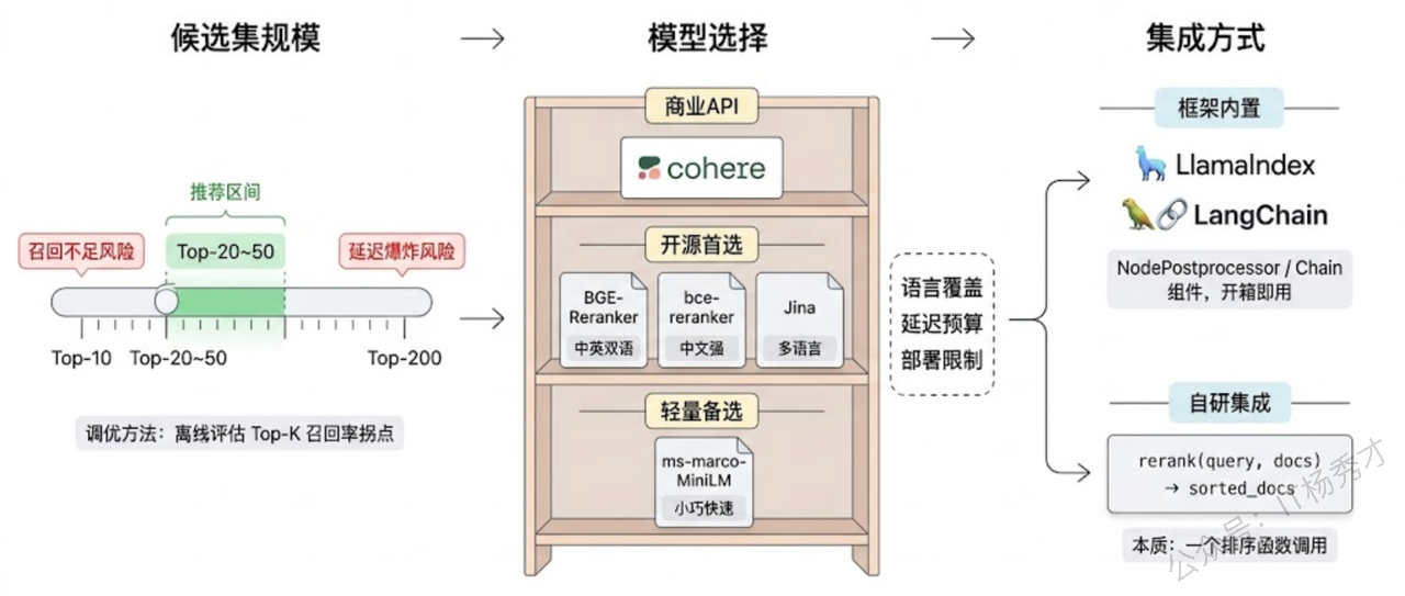 第三个决策是集成方式。好消息是主流的 RAG 框架都已经内置了 Rerank 的支持。LlamaIndex 提供了 SentenceTransformerRerank、CohereRerank 等开箱即用的 NodePostprocessor;LangChain 也有 CohereRerank、CrossEncoderReranker 等组件可以直接插入检索链。如果用的是自研的 RAG 框架,集成也不复杂——本质上就是在检索之后、生成之前加一个函数调用:输入是 (query, documents) 列表,输出是重新排序后的 documents 列表。