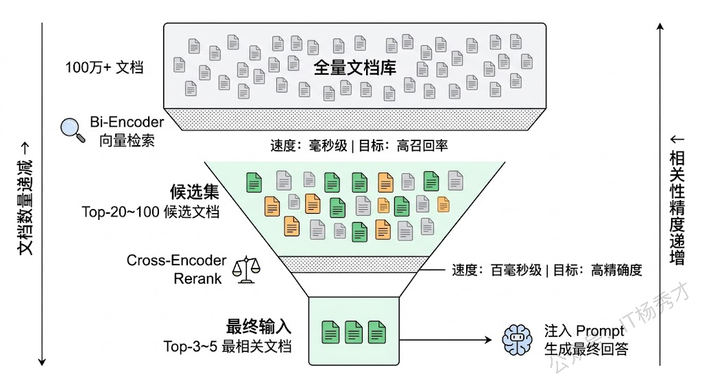 整个 RAG 的检索过程可以类比为一个漏斗。最上面是全量文档库(可能有几十万甚至上百万条),向量检索作为第一道粗筛,用 Bi-Encoder 快速从海量文档中捞出一个候选集(通常是 Top-20 到 Top-100)。这一步要的是召回率——宁可多捞一些不太相关的,也不能漏掉真正相关的。然后 Rerank 作为第二道精筛,用更强大的模型对这个小规模候选集逐一做精细评估,重新打分排序,把真正最相关的文档排到前面。这一步要的是精确度——在候选集里挑出最好的那几条。最终排在最前面的 Top-3 或 Top-5 文档,才会被拼接到 Prompt 里给 LLM 生成答案。