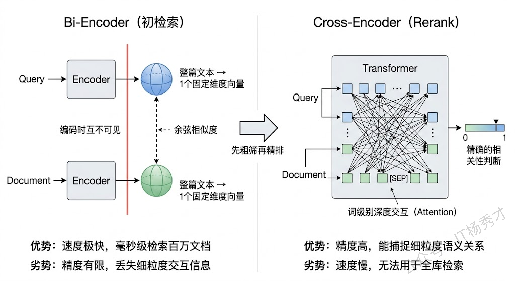 举个实际的例子。假设用户问"Python 中怎么处理大文件的内存溢出问题",向量检索可能同时召回了这么几个文档片段:一篇讲 Python 内存管理机制的文章(高度相关)、一篇讲 Java 大文件处理的文章(主题相似但语言不对)、一篇讲 Python 基础语法的文章(语言对但主题偏了)。Bi-Encoder 算出来的向量相似度,三篇可能都差不多,因为它们在语义空间中的向量本来就离得不远。但一个真正理解问题的人,一眼就能排出高下——这就是 Rerank 要做的事。
