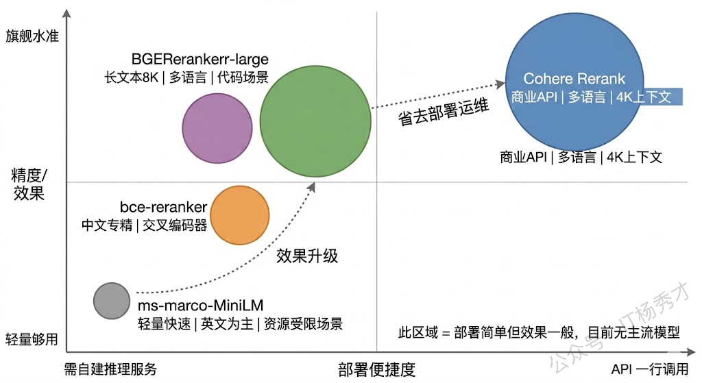 第二个决策是模型选择。目前主流的 Rerank 模型可以大致分为三个梯队。第一梯队是商业 API:Cohere Rerank(开箱即用,效果稳定)和各云厂商提供的重排服务。第二梯队是开源的 Cross-Encoder 模型:BGE-Reranker 系列(智源出品,中英文效果都很好,有 base/large/v2 多个版本可选)、bce-reranker(网易有道出品,在中文场景表现突出)、Jina Reranker。第三梯队是通用的 sentence-transformers Cross-Encoder(如 cross-encoder/ms-marco-MiniLM-L-12-v2),体积小速度快但精度稍逊。选型时要综合考虑语言覆盖(如果业务涉及中文,BGE 和 bce 是优先选择)、模型大小和推理延迟、以及是否能本地部署。