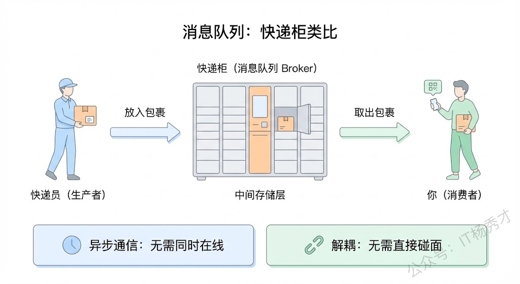 理解消息队列最好的类比是"快递柜"。你网购下单后,快递员不需要等你在家才能送货,他把包裹放进快递柜(Broker),你有空了再去取。这个中间存储环节让发件人和收件人不需要同时在线、不需要直接碰面,这就是消息队列的本质——在发送方和接收方之间加一个中间存储层,实现异步、解耦的通信。