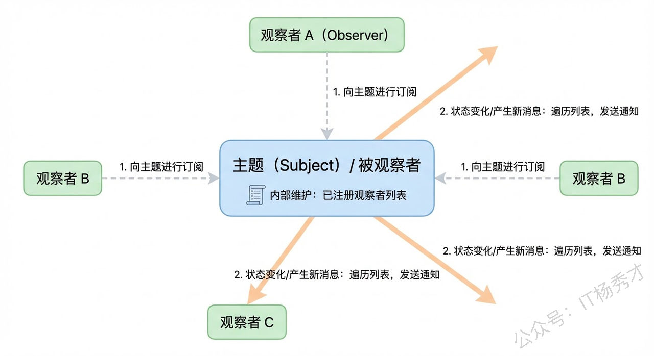 观察者模式:观察者模式本质上体现的是一种一对多的依赖关系。在该模式中包含一个主题(Subject)和多个观察者(Observer),其中主题同时也被称为被观察者。当主题产生新的消息或状态发生变化时,会向所有已经注册的观察者发送通知,使它们能够获取到最新的信息。其结构如图所示:首先,各个观察者需要向主题进行订阅;订阅完成后,主题内部会维护一个观察者列表。当主题发布消息时,会遍历这个观察者列表,并依次向每个观察者发送通知,从而完成消息的传递。