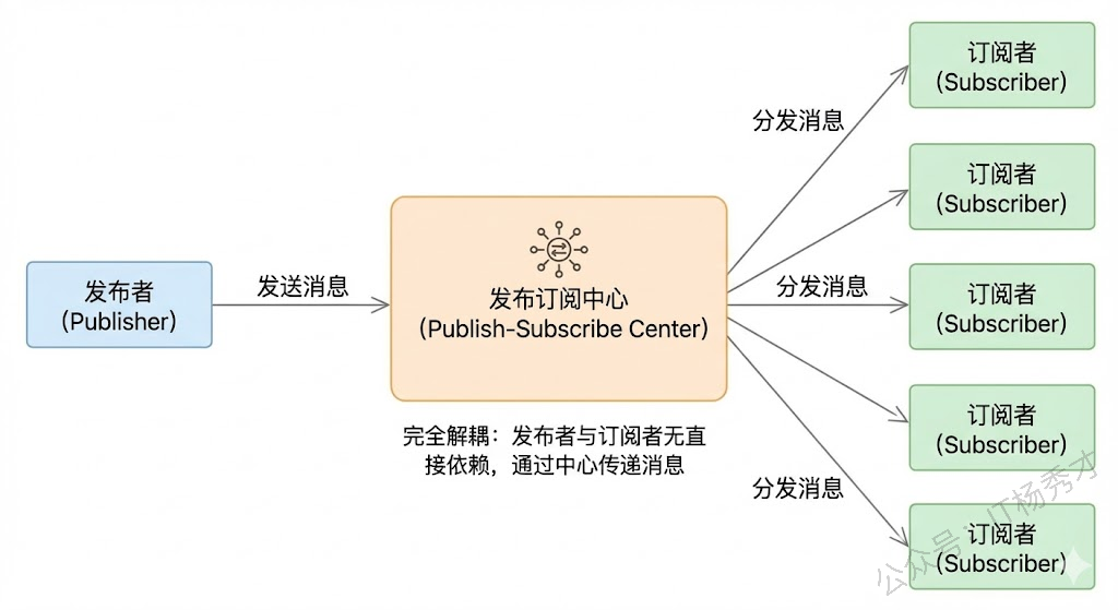发布订阅模式:发布订阅模式与观察者模式的主要区别在于:发布者与订阅者之间实现了完全解耦。在这种模式中,消息的传递需要通过一个中间的发布订阅中心来完成。发布者只负责发布消息,而不需要知道消息最终会被哪些订阅者接收,因此两者之间不存在直接依赖关系。正因为如此,发布订阅模式通常包含三个核心角色:发布者、发布订阅中心以及订阅者。消息的流转过程为:发布者将消息发送到发布订阅中心,再由发布订阅中心将消息分发给相应的订阅者。