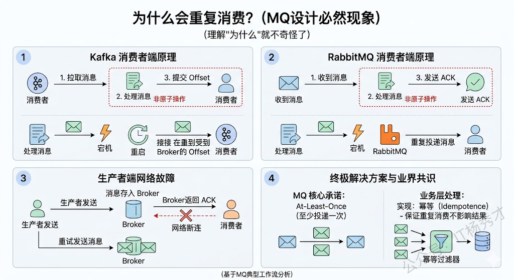 知识点分析: 重复消费看起来像bug,但实际上是MQ设计中的必然现象,理解了"为什么会重复"你就不会觉得奇怪了。