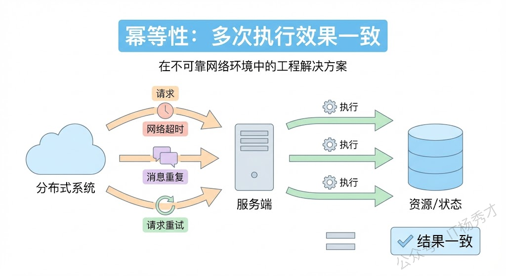 在分布式系统中,网络超时、消息重复、请求重试无处不在,你没办法保证一个操作只被执行一次。既然如此,换个思路:不保证只执行一次,但保证执行多次效果一样——这就是幂等性的工程意义。