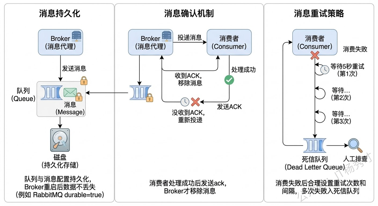消息可靠性保障的三种机制各自解决不同阶段的问题,理解了"每个机制防的是什么风险",就不需要背了: