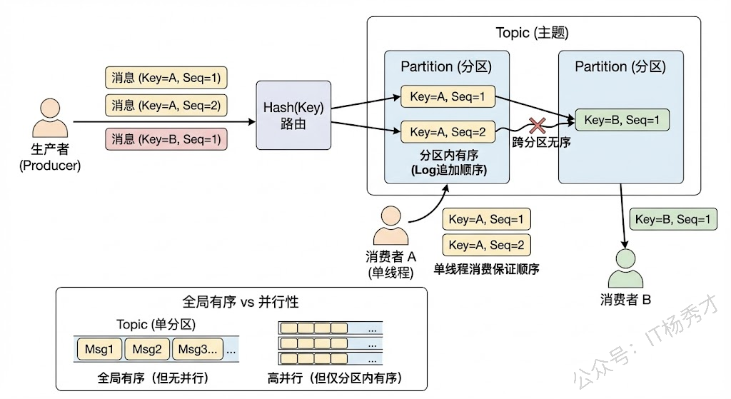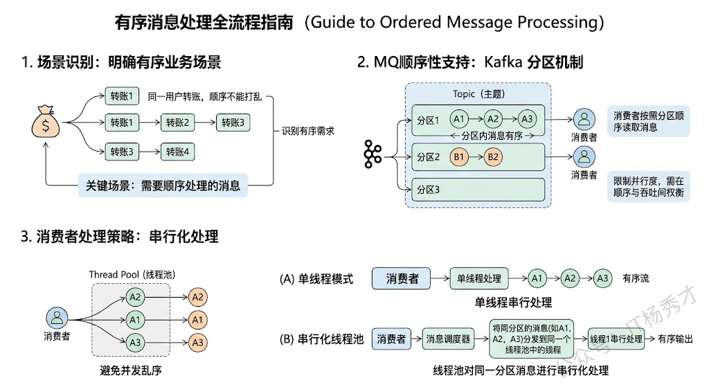 首先要识别业务中哪些消息需要保证顺序,比如同一个订单的创建、支付、完成这三条消息必须按序消费。保证顺序的核心思路是把需要有序的消息发到同一个队列或分区里。以Kafka为例,通过给消息指定相同的Key,保证相同Key的消息发到同一个Partition,Partition内天然有序。消费端要用单线程消费同一个分区的消息,不能多线程并发处理否则顺序会乱。不同业务之间的消息可以并发消费,只需要保证同一组业务内的顺序就行。如果需要全局有序,只能用一个分区,但这样会牺牲并行处理能力。