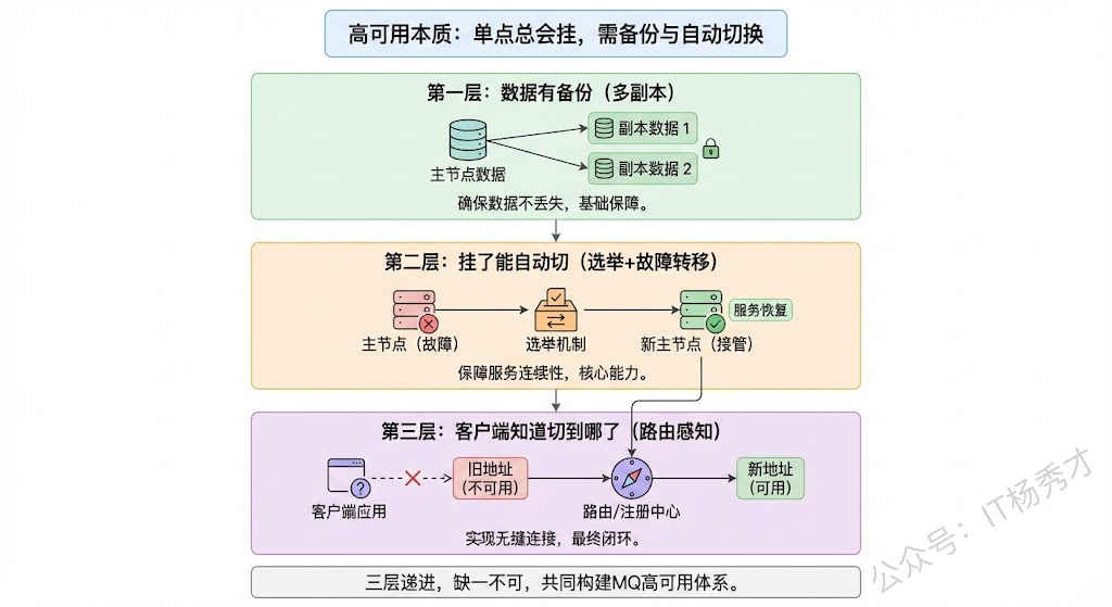这三层是递进关系,缺一不可——有备份但不能自动切,还是要停服;能自动切但客户端不知道新地址,还是连不上。记住这个"三板斧"框架,不管问哪个MQ的高可用你都能有条理地回答。