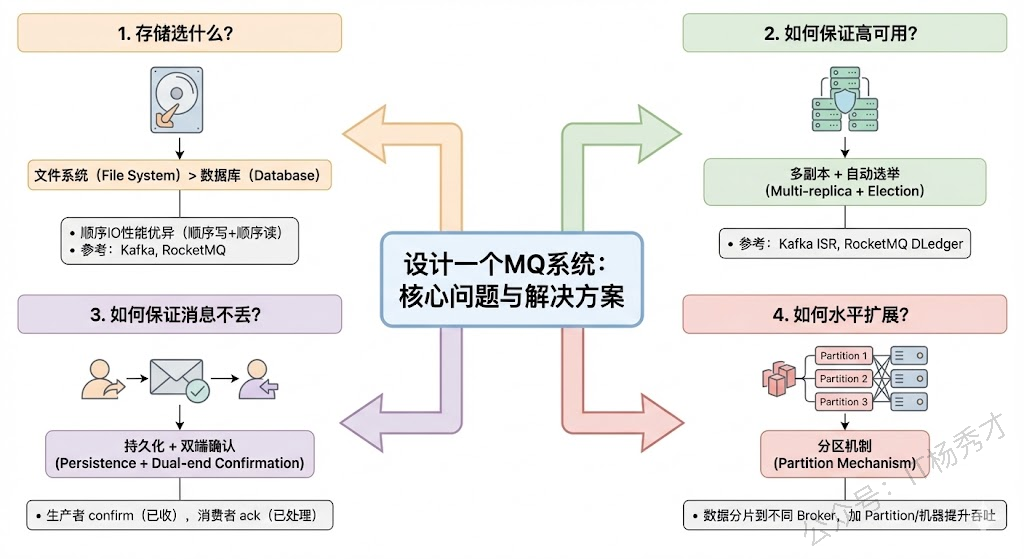 设计一个MQ系统需要解决几个核心问题,每个问题背后都有成熟的工业方案可以参考: