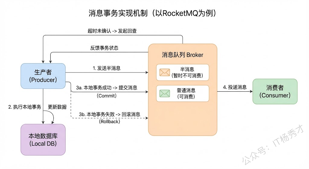 RocketMQ实现的是最终一致性的分布式事务。流程是这样的:A服务先发一条半事务消息(Half Message)给Broker,这条消息暂时不能被消费者消费。Broker存储成功返回ack后,A服务开始执行本地事务。如果本地事务成功就发commit,Broker把消息状态改为可投递,下游B服务就能消费到;如果本地事务失败就发rollback,Broker直接删除这条半消息。如果因为网络问题Broker迟迟收不到commit或rollback,它会主动回查A服务的本地事务状态来决定提交还是回滚。这样就保证了只有A的本地事务成功,B才会收到消息。如果B消费失败,RocketMQ有重试机制,不是代码bug的话重试几次一般能成功,实在不行进死信队列人工兜底。