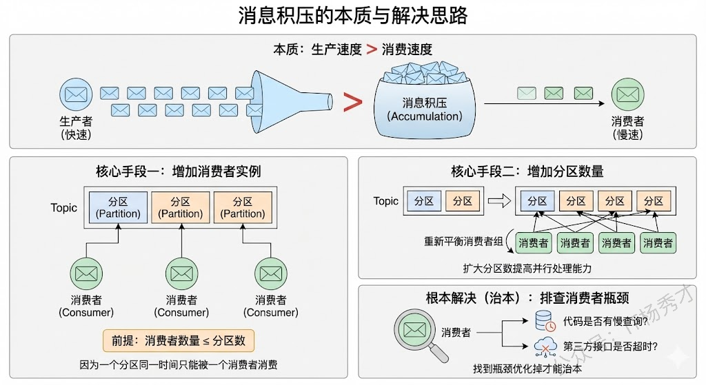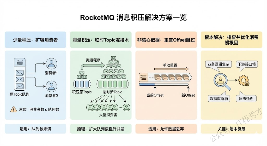 先评估积压原因,排查是否有bug。少量积压可以扩容消费者,但要注意RocketMQ一个队列只能被一个消费者消费,消费者数超过队列数就没意义了。海量积压用临时Topic嫁接术,写搬运程序把积压消息转到一个队列数量多几十倍的新Topic,部署对应数量的消费者快速清理。非核心数据可以直接重置offset跳过。最后一定要排查消费慢的根因并优化。
