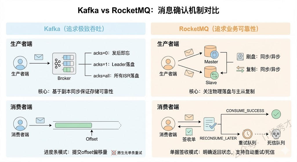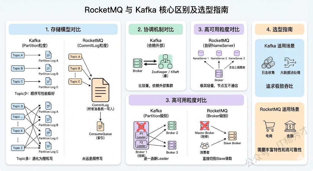 高可用粒度上,Kafka是Partition级别的选举,一台Broker挂了要对上面所有Partition逐一选新Leader。RocketMQ是Broker节点级别的主从,Master挂了消费者直接切到Slave读取。