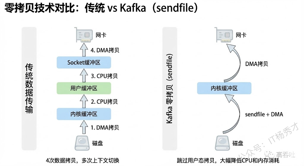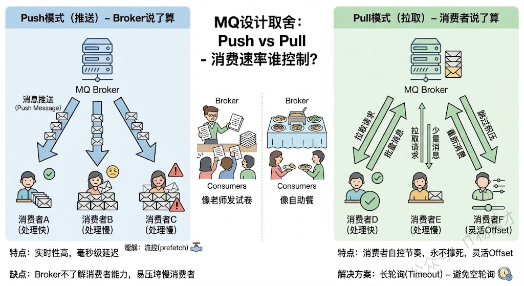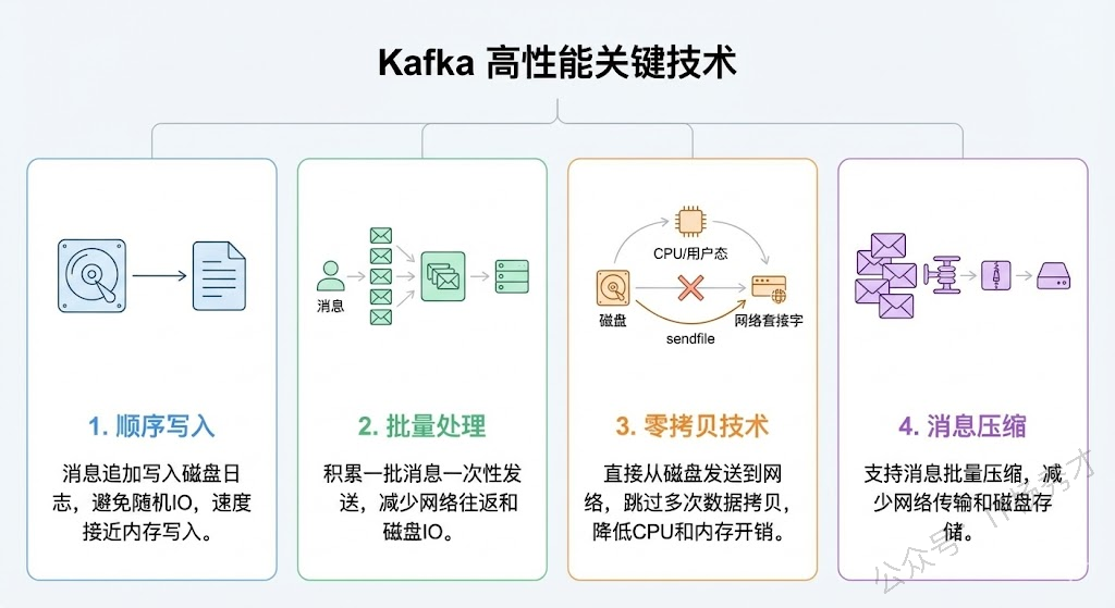 存储选什么? 文件系统优于数据库——Kafka和RocketMQ都选择了文件系统,因为消息的读写模式是顺序追加写+顺序读,文件系统的顺序IO性能远超数据库的B+树随机IO。