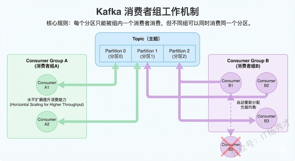 以Kafka为例,消费者的工作流程是:拉取消息 → 处理消息 → 提交offset(告诉Broker"我已经消费到第N条了")。关键问题在于"处理消息"和"提交offset"是两个独立的步骤,不是原子操作。假设消费者拉了第100条消息,处理完了,正准备提交offset=100,这一瞬间消费者宕机了。重启后Broker发现上次提交的offset还是99,于是又把第100条消息推给消费者——重复消费就这么发生了。