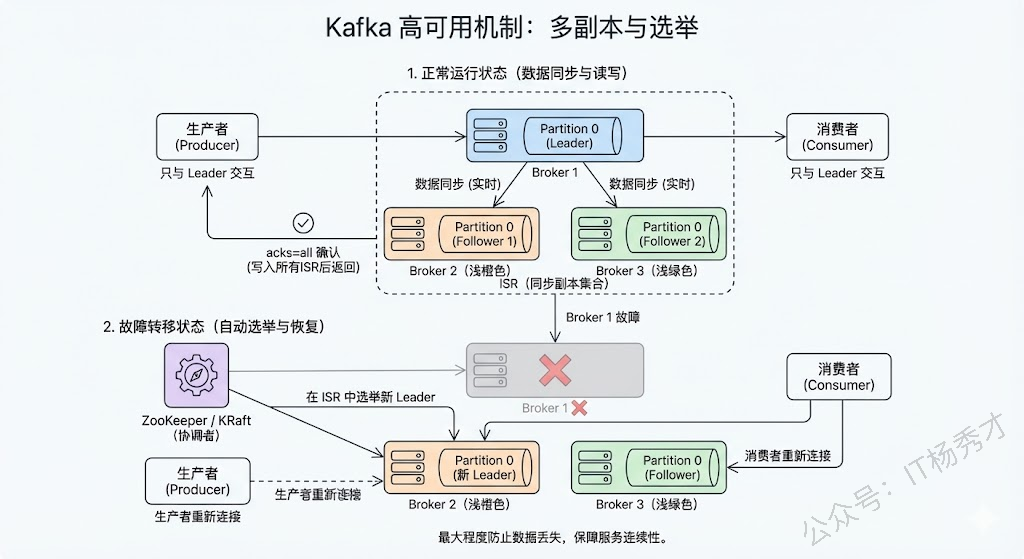 第二步是自动选主和故障转移。有了副本还不够,主节点挂了得有机制自动把从节点提拔为新的主节点。Kafka依赖ZooKeeper或KRaft,RocketMQ用DLedger机制,底层都是类Raft选举算法,发现主节点心跳停了就在从节点中选一个数据最全的升为新主,整个过程秒级完成。