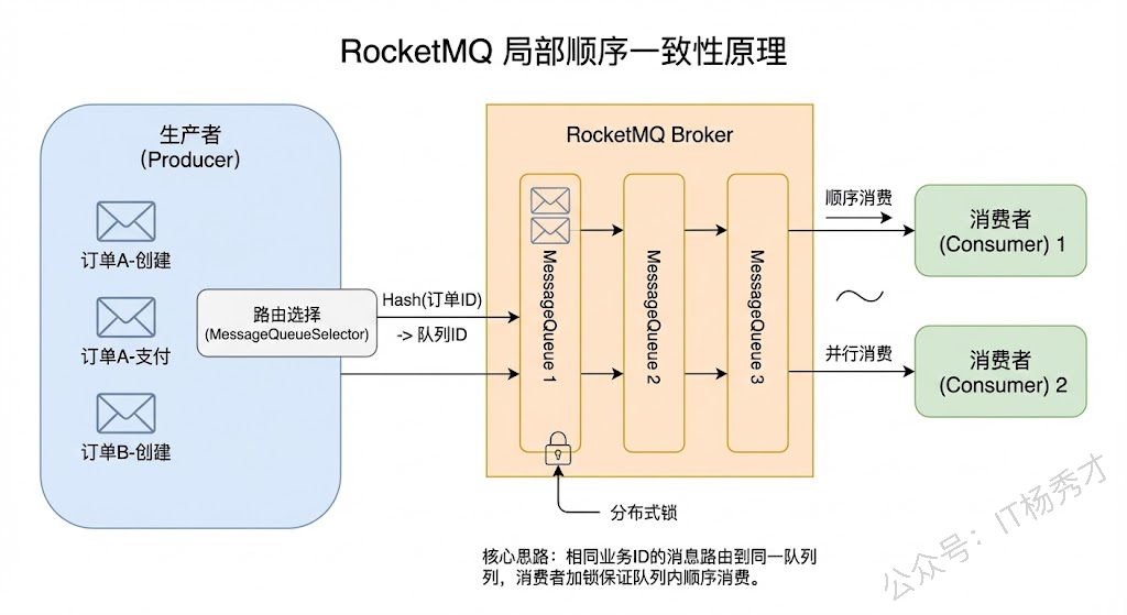 RocketMQ采用的是局部顺序一致性。核心思路是把需要保证顺序的一组消息发到同一个MessageQueue中。比如同一个订单的创建、支付、完成消息,通过订单ID做hash路由到同一个队列。生产者端通过MessageQueueSelector来指定队列,消费者端RocketMQ通过对MessageQueue加锁来保证同一个队列同一时刻只被一个消费者消费,这样就保证了队列内消息的顺序消费。不同业务(比如不同订单)的消息可以分布在不同队列上并行消费,在保证顺序的同时兼顾了吞吐量。